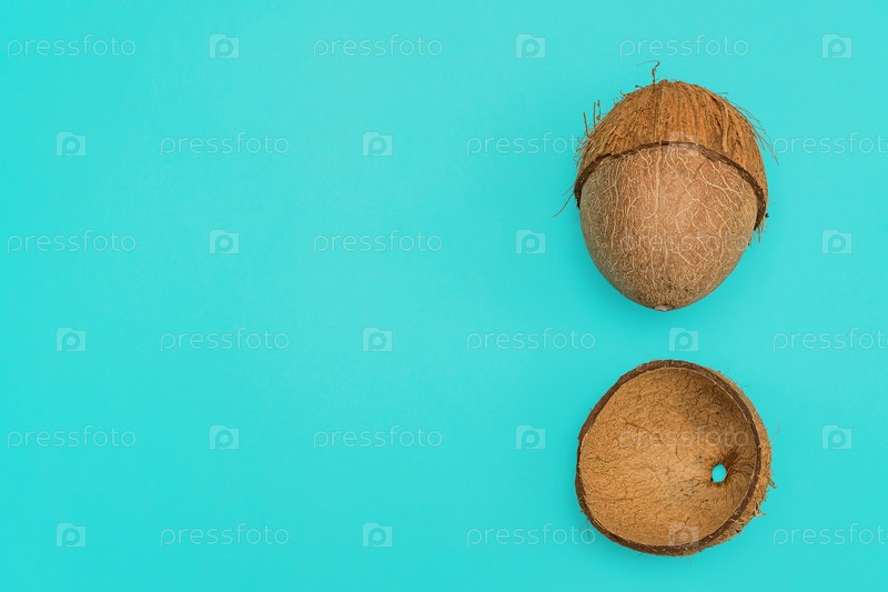Сломанный сырой кокос на синем фоне. Вид сверху, плоская планировка с копией пространства