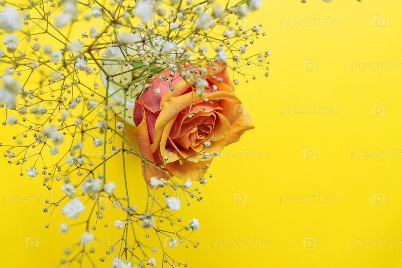 Цветочная композиция. Розовая роза, белая гипсофила на желтом фоне. Открытка на день рождения или женский день с копией пространства