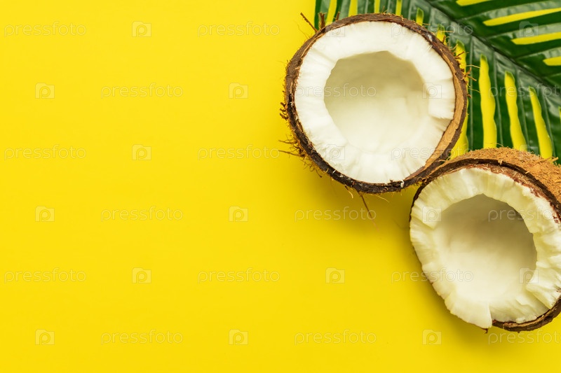 Яркий тропический фон со сломанным кокосом на пальмовом листе, минимальная плоская планировка с копировальным пространством