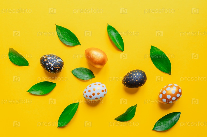 Праздничный пасхальный фон. Золотые, черно-белые стильные крашеные яйца с листьями на желтом фоне