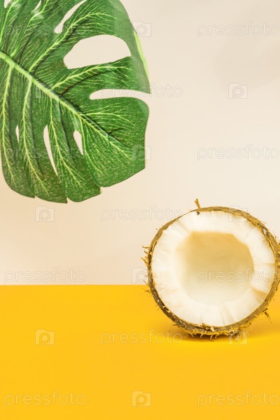 Половина свежего сырого кокоса на желтом фоне с листом монстера. Концепция тропической еды