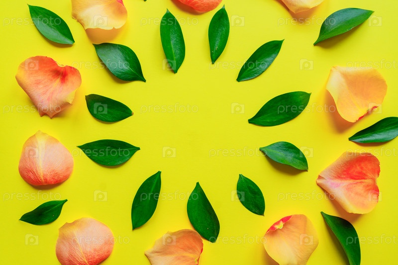 Рамка с зелеными листьями Рускуса и листвочками роз на желтом фоне. Яркая весенняя модная плоская планировка. В полном цвете