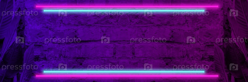 Эффект освещения обрамляет розовый и синий неон на кирпичной стене для фоновой вечеринки или вашего текста. Зеленые листья тропического растения рядом с кирпичной стеной чердака. Баннер