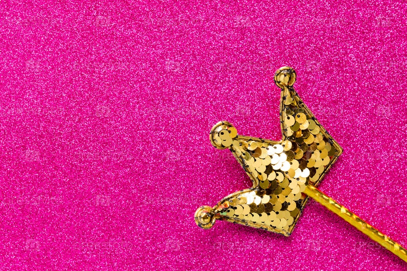 Золотая волшебная палочка из блесток в форме короны на фоне розового блеска. Креативная квартира лежала крупным планом