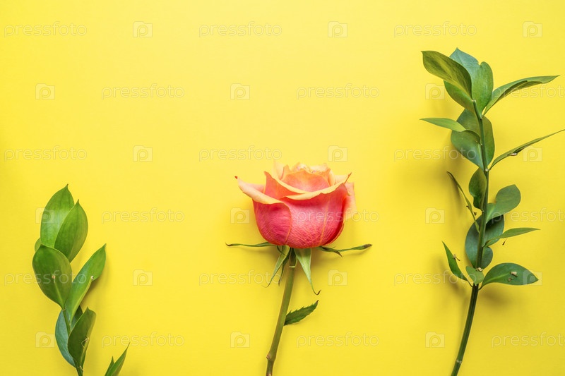 Цветочная композиция. Розовые цветы и ветки эвкалипта на желтом фоне. Плоская планировка, вид сверху, пространство для копирования