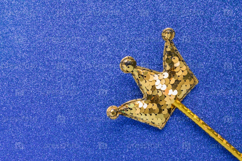 Золотая волшебная палочка из блесток в форме короны на фоне синего блеска. Креативная квартира лежала крупным планом