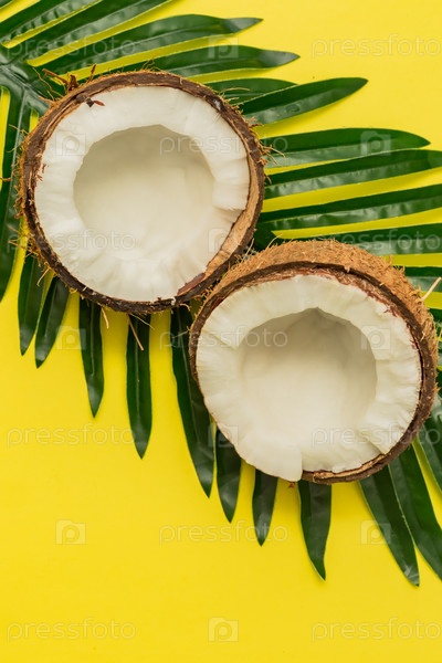 Яркий тропический фон со сломанным кокосом на пальмовом листе
