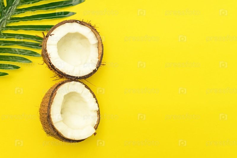 Половинки свежего сырого кокоса на ярко-желтом фоне. Вид сверху, плоская планировка