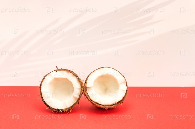 Две половинки свежего сырого кокоса на красном фоне с яркими тенями в белом