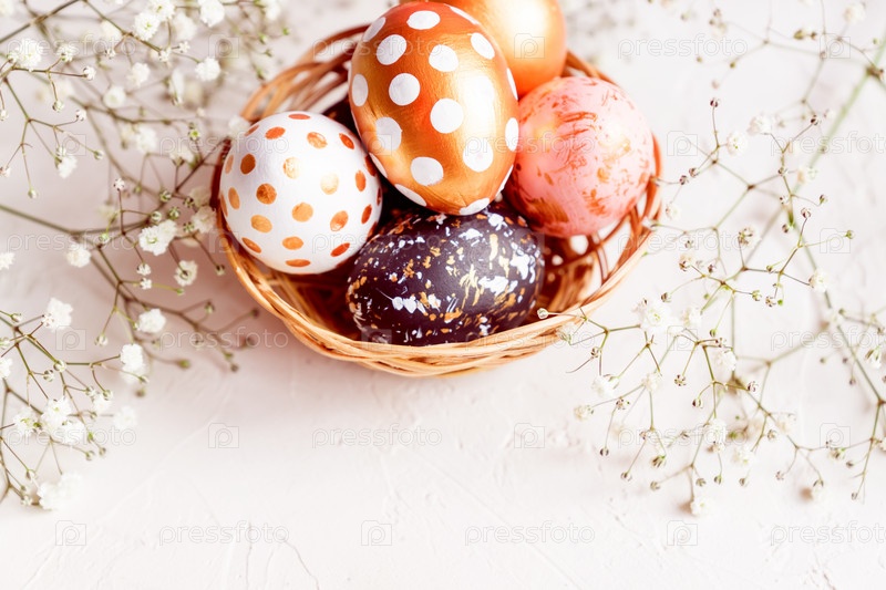 Крупный план черных, белых и золотых украшенных пасхальных яиц в плетеной корзине, украшенной гипсофилой на белом фоне. Скопируйте место для текста. Тонированное изображение