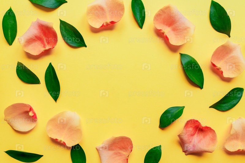 Рамка с зелеными листьями Рускуса и листвочками роз на желтом фоне. Яркая весенняя модная плоская планировка. В полном цвете