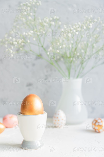 Крупный план золотого яйца в яичной чашке на фоне букета гипсофилы. Уютный пасхальный натюрморт