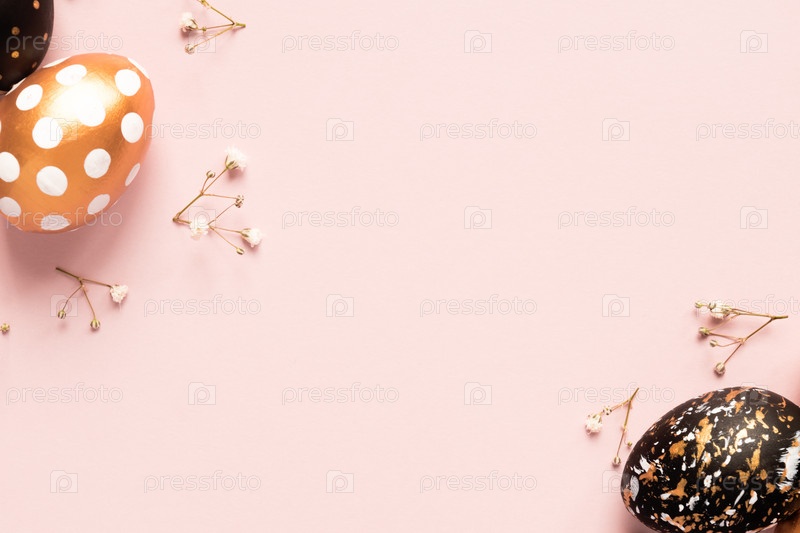 Вид сверху на деревянные крашеные яйца золотого, черного и розового цветов с веткой гипсофилы на розовом фоне. Счастливый пасхальный фон