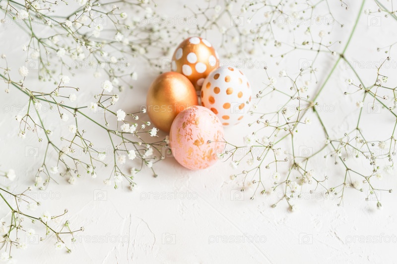 Красочные пасхальные яйца окрашены в золотой, белый и розовый цвета на белом фоне, украшенном цветами гипсофилы. Нежный творческий праздничный фон с копией пространства