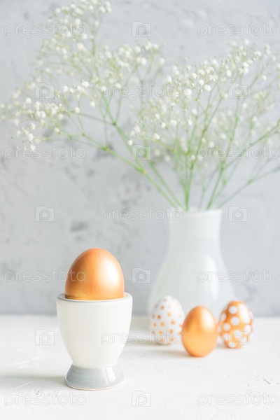 Крупный план золотого яйца в яичной чашке на фоне букета гипсофилы. Уютный пасхальный натюрморт