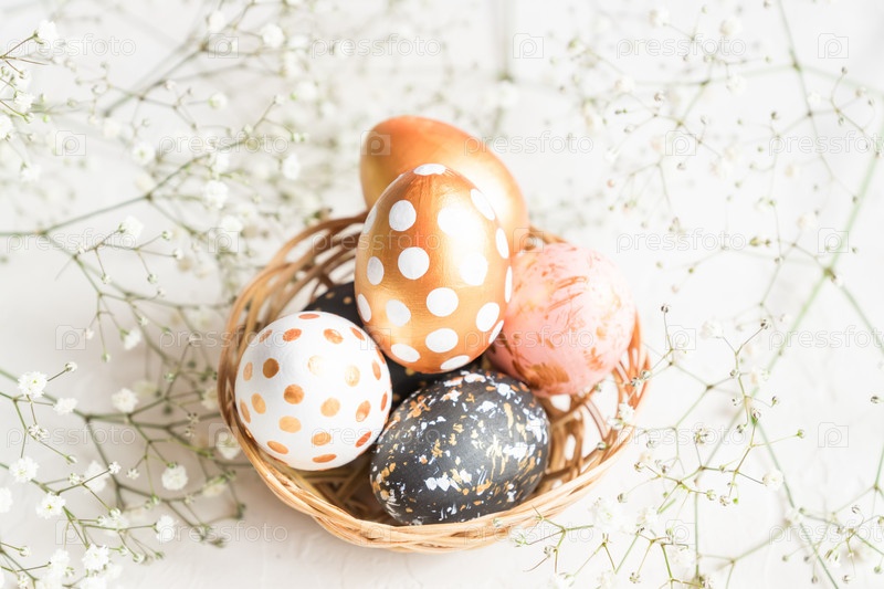 Крупный план черных, белых и золотых украшенных пасхальных яиц в плетеной корзине, украшенной гипсофилой на белом фоне