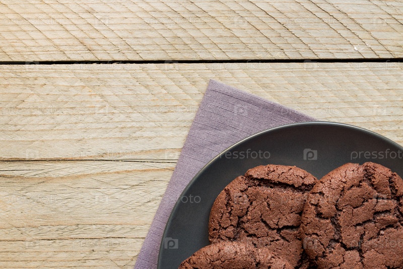 Вид сверху на домашнее шоколадное печенье на черной тарелке на деревянном фоне. Домашняя пекарня