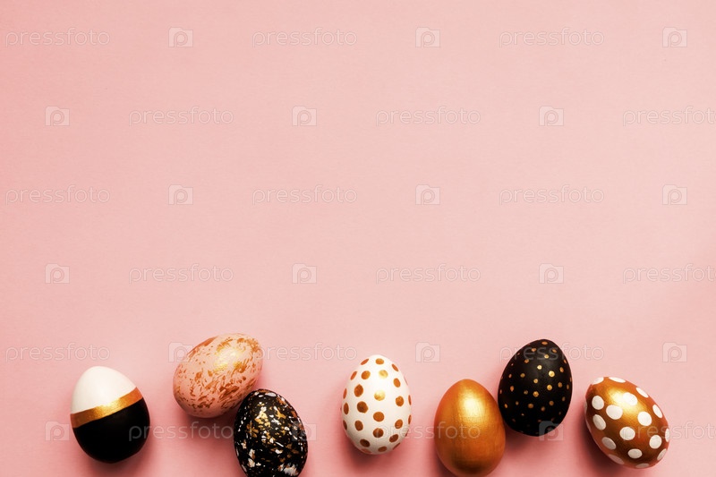 Рамка из деревянных крашеных яиц в золотых, черных и розовых тонах на розовом фоне. Счастливой пасхи фон с копией пространства