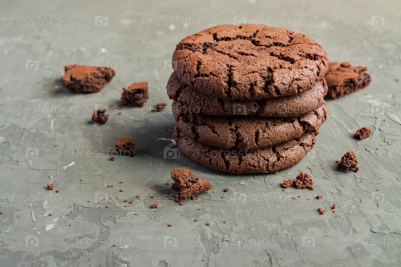 Шоколадное хрустящее печенье - американская сладкая еда. Вид сбоку с копией пространства