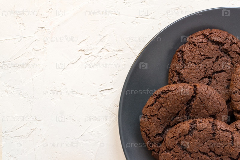 Вид сверху, печенье с шоколадной крошкой на черной тарелке. белый бетонный фон. Сверху. копировать пространство