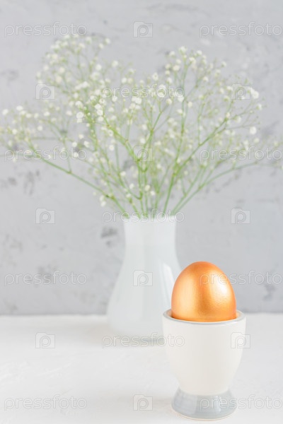 Пасхальный натюрморт с яйцами и цветущими цветами гипсофилы на сером фоне
