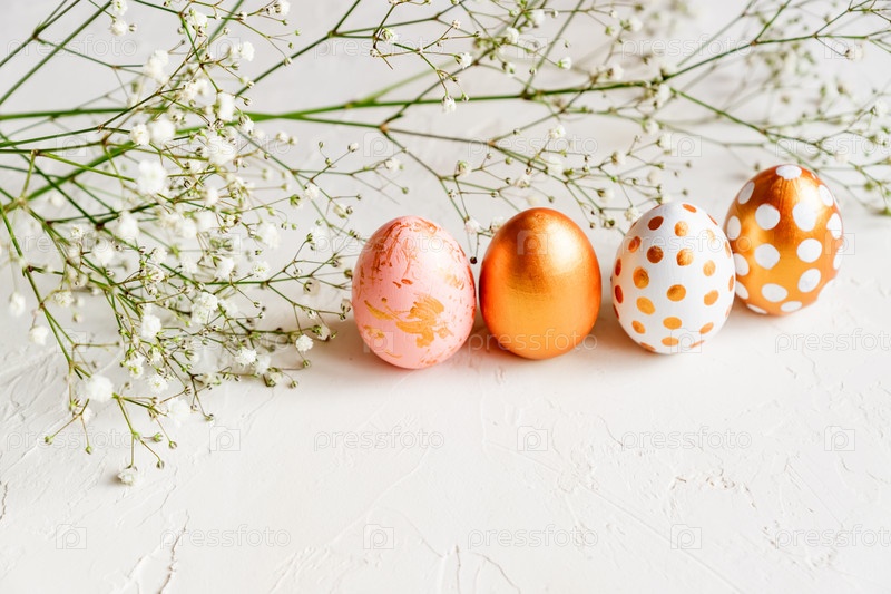 Красочные пасхальные яйца окрашены в золотой, белый и розовый цвета на белом фоне, украшенном цветами гипсофилы
