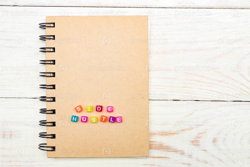 Слова Side Hustle, сделанные из разноцветных квадратных бусин на спиральной обложке тетради.Концептуальный образ пассивного дохода