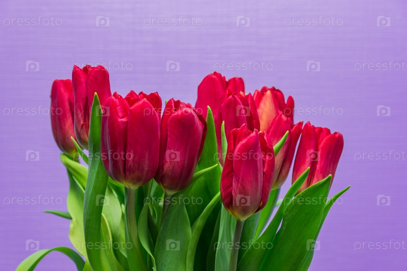 Весенняя открытка. Букет красных тюльпанов на фиолетовом фоне. Концепция женского дня. Copyspace для текста