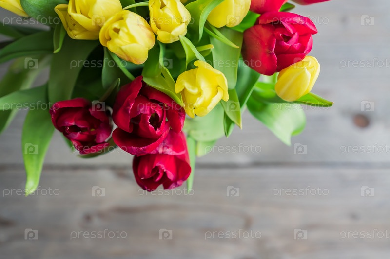 Вид сверху на букет красных и желтых тюльпанов. Цветочный фон. Праздничная открытка на день матери или день рождения