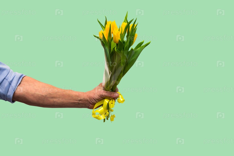 Рука человека с букетом желтых тюльпанов на зеленом фоне. Весна. Концепция дня женщины и матери