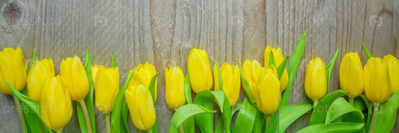 Вид сверху на желтые тюльпаны на деревянном фоне. Баннер для вашего дизайна. Концепция женщин и день матери
