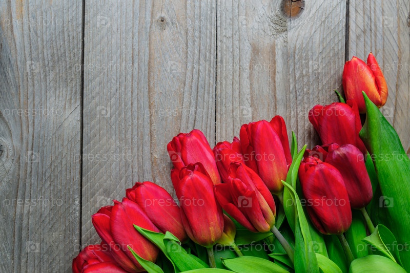Праздничная открытка с букетом цветущих красных тюльпанов. Весенний фон с копией пространства