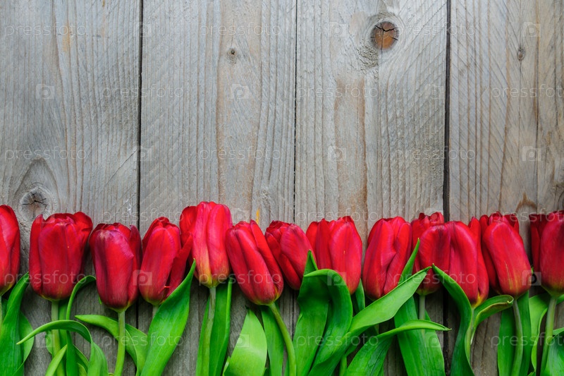 Праздничная открытка с букетом цветущих красных тюльпанов. Весенний фон с копией пространства