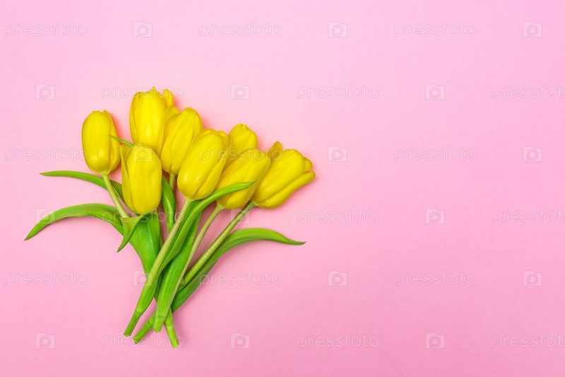 Букет желтых тюльпанов на розовом фоне. Праздничная планировка. Скопируйте место для текста. Открытка на праздники