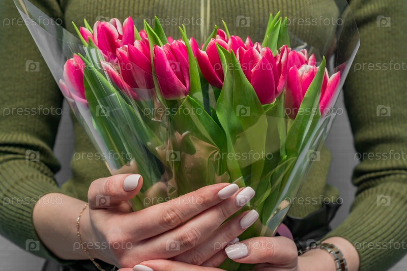 Кавказская женщина в зеленой блузке, держа букет розовых тюльпанов. Подарок на праздники
