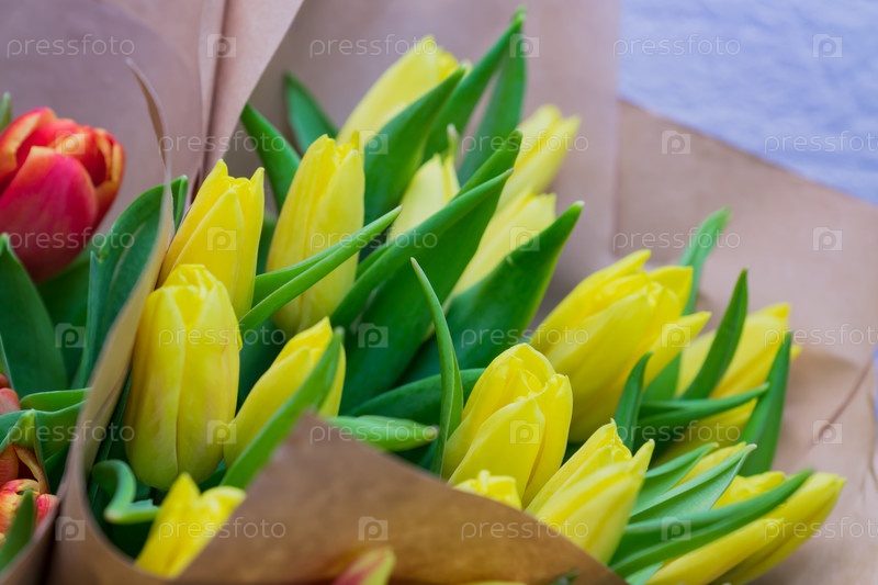 Цветущий весенний букет из желтых цветов тюльпана в крафт-бумаге. Подарок на женский день или день рождения