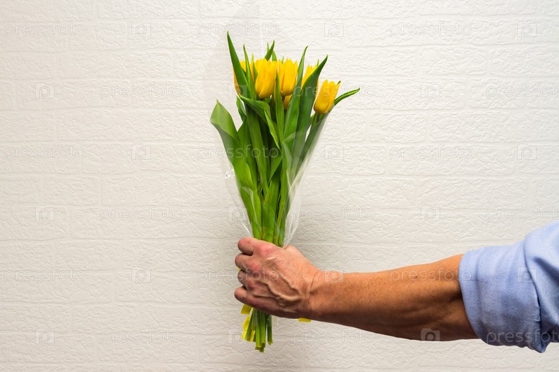 Мужская рука с букетом желтых тюльпанов на фоне белой кирпичной стены. Весна. Концепция дня женщины и матери