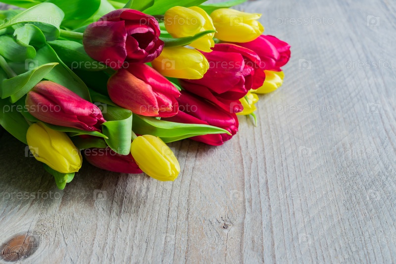 Праздничная открытка с букетом цветущих красных и желтых тюльпанов. Весенний фон с копией пространства
