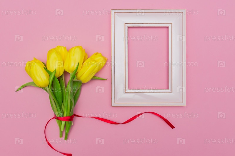 Красивая композиция с весенними цветами. Фоторамка, букет желтых тюльпанов на пастельно-розовом фоне
