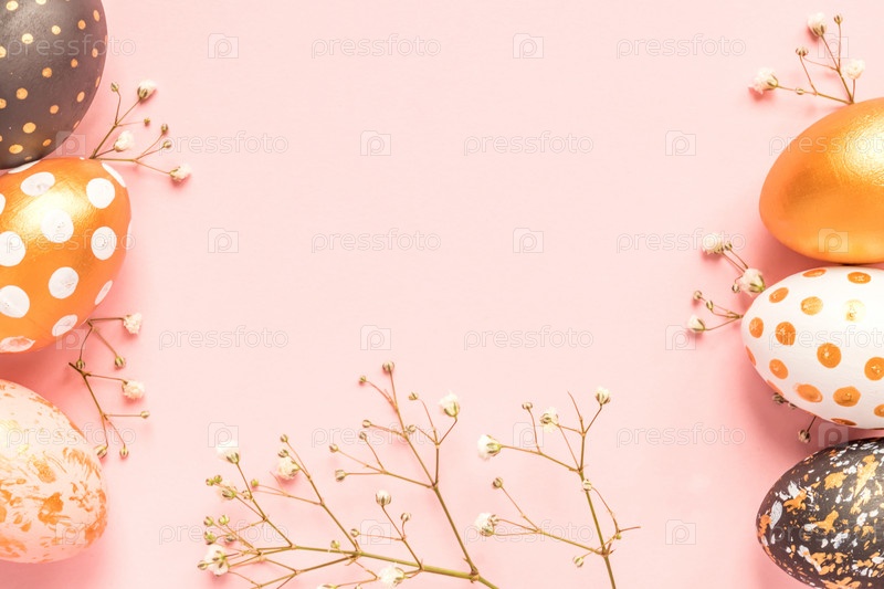 Вид сверху на деревянные крашеные яйца золотого, черного и розового цветов с веткой гипсофилы на розовом фоне