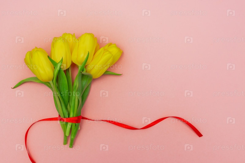 Букет желтых тюльпанов с красной лентой на розовом фоне. Праздничная планировка. Скопируйте место для текста. Открытка на праздники