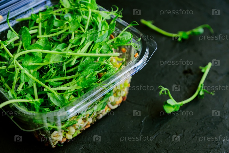 Микрозелень свежего органического гороха в пластиковой коробке на черном фоне. Здоровые сырые ростки. Натуральное питание