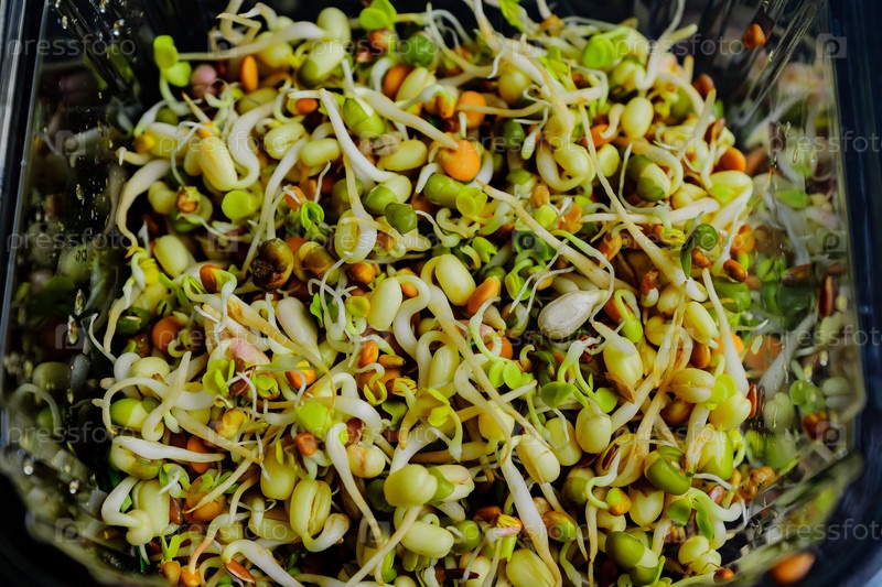 Пророщенная чечевица, фасоль, маш, горох, редис, лен, подсолнечник в пластиковой таре. веган, сыроедение, избирательный подход