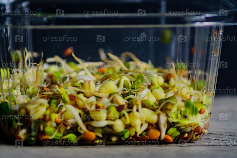 Пророщенная чечевица, фасоль, маш, горох, редис, лен, подсолнечник в пластиковой таре. веган, сыроедение, избирательный подход