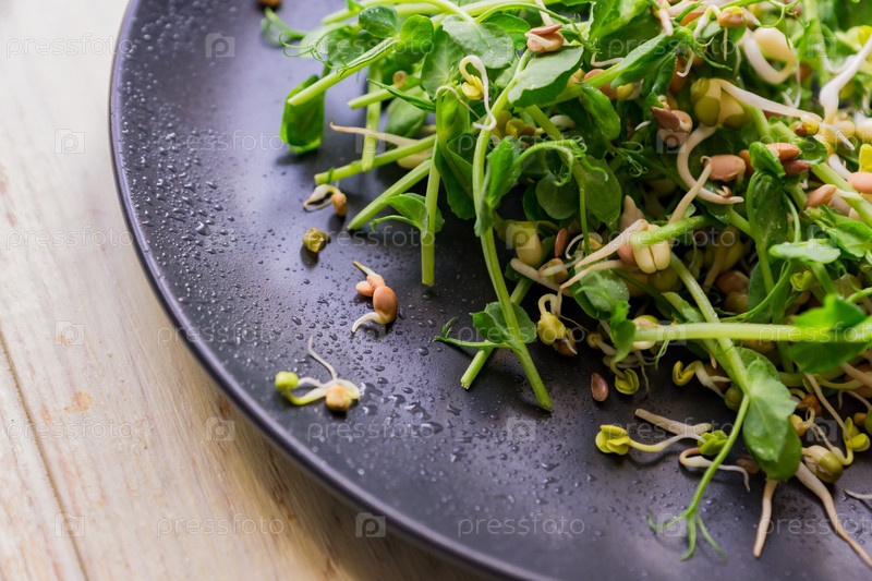 Крупный план веганского здорового салата из гороха, микрозелени, ростков и пророщенной фасоли
