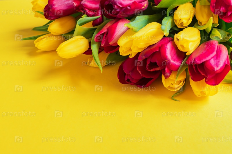 Букет цветущих желтых и красных тюльпанов на желтом фоне. Место для текста, без изображения