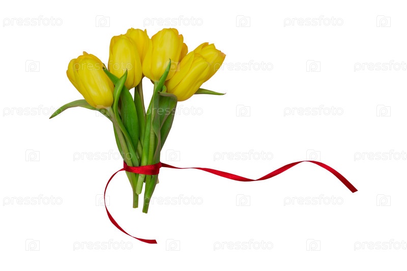 Красивый цветущий букет желтых тюльпанов с красной атласной лентой на белом фоне. Путь отсечения