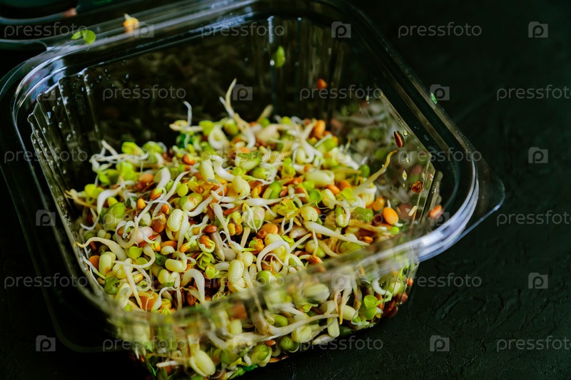 Пророщенная чечевица, фасоль, маш, горох, редис, лен, подсолнечник в пластиковой таре. веган, сыроедение, избирательный подход