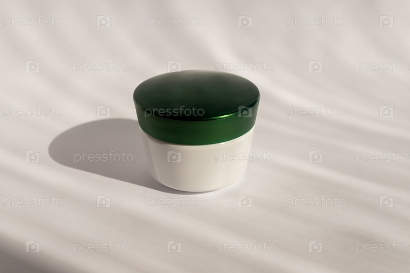 Белый пустой макет бутылочного контейнера для сливок с зеленой чашкой. Профессиональные тюбики для ухода за лицом и телом. Концепция ухода за кожей и хорошего самочувствия