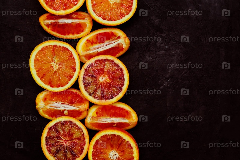 Вид сверху на половинки и четвертинки свежего кровавого апельсина на черном фоне с копировальным пространством. Тонированное изображение
